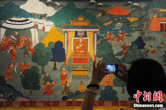 手繪大型歷史題材卷軸唐卡《涼州會(huì)盟》。中新社記者 楊艷敏 攝