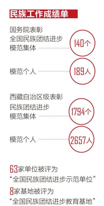 在西藏,民族團(tuán)結(jié)家庭并不是個(gè)例,有不少個(gè)人和集體也為民族團(tuán)結(jié)進(jìn)步事業(yè)作出了突出貢獻(xiàn)。目前,西藏全區(qū)榮獲國務(wù)院表彰全國民族團(tuán)結(jié)進(jìn)步模范集體140個(gè)、模范個(gè)人189人;西藏自治區(qū)級(jí)表彰民族團(tuán)結(jié)進(jìn)步模范集體1794個(gè)、模范個(gè)人2657人;63家單位被評為“全國民族團(tuán)結(jié)進(jìn)步示范單位”,8家基地被評為“全國民族團(tuán)結(jié)進(jìn)步教育基地”。拉薩、日喀則、昌都、阿里、林芝5個(gè)市地成功創(chuàng)成“全國民族團(tuán)結(jié)進(jìn)步示范地(市)”。