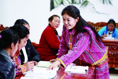 西藏墨脫縣墨脫鎮(zhèn)亞東村,上過中學(xué)的嘎迪利用晚上時(shí)間輔導(dǎo)村民學(xué)習(xí)漢字講普通話。季春紅攝/光明圖片