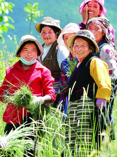 西藏加查縣共康村村民互助組在割草,為過冬的牛羊儲(chǔ)備飼料。郭紅松攝/光明圖片