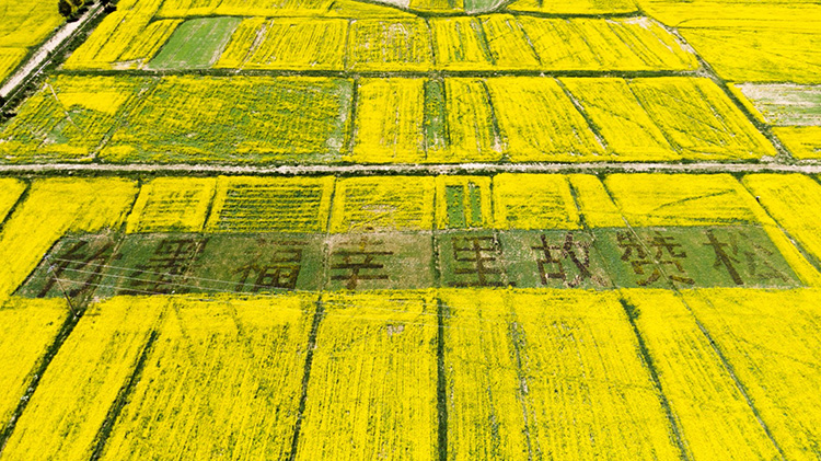 圖為航拍油菜花組成的“喜迎二十大”圖案。