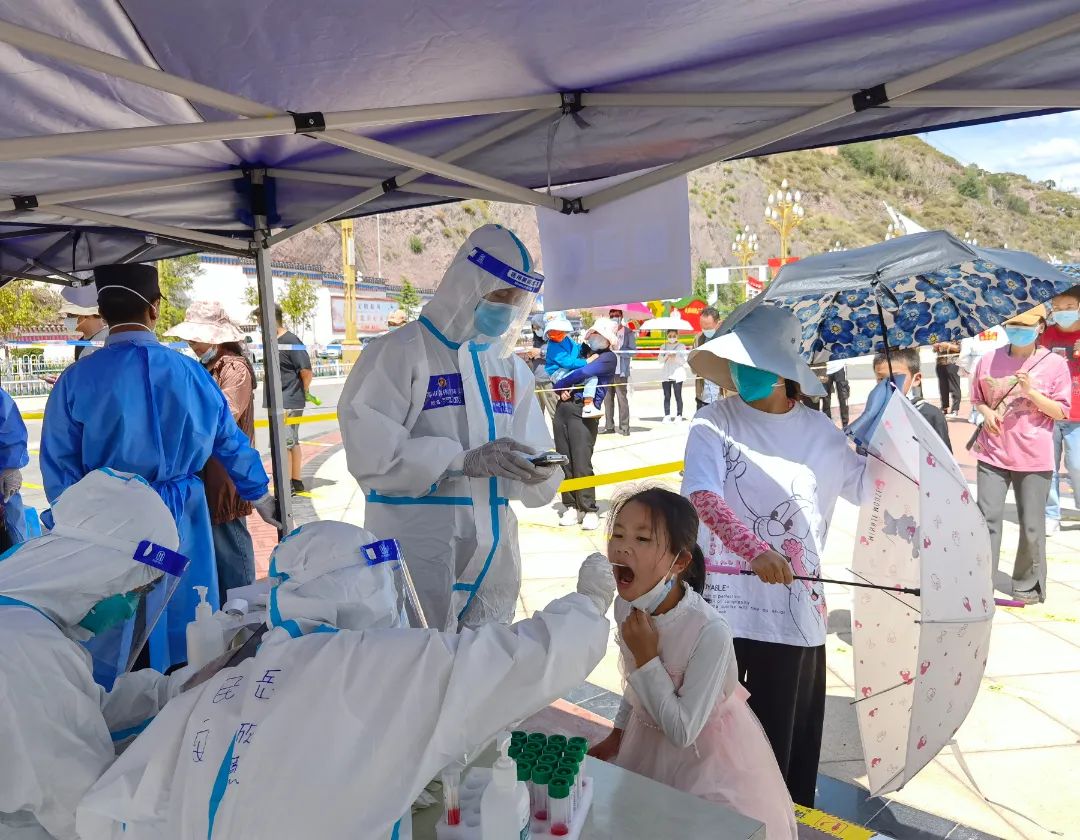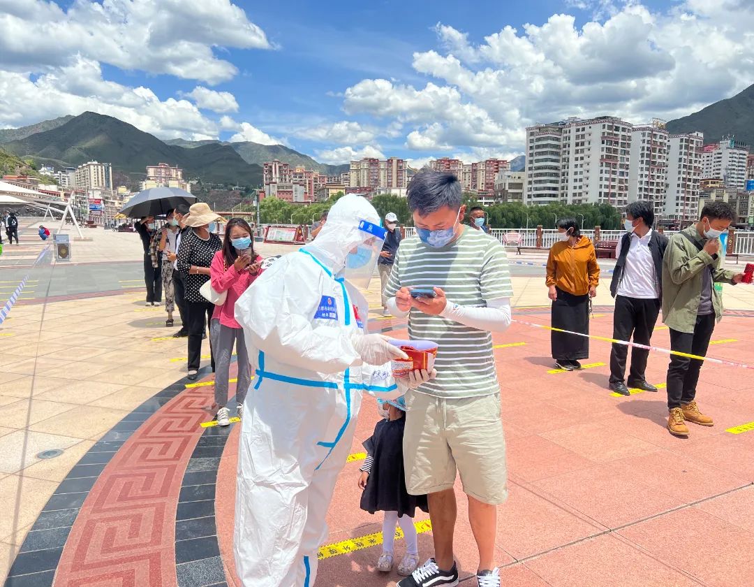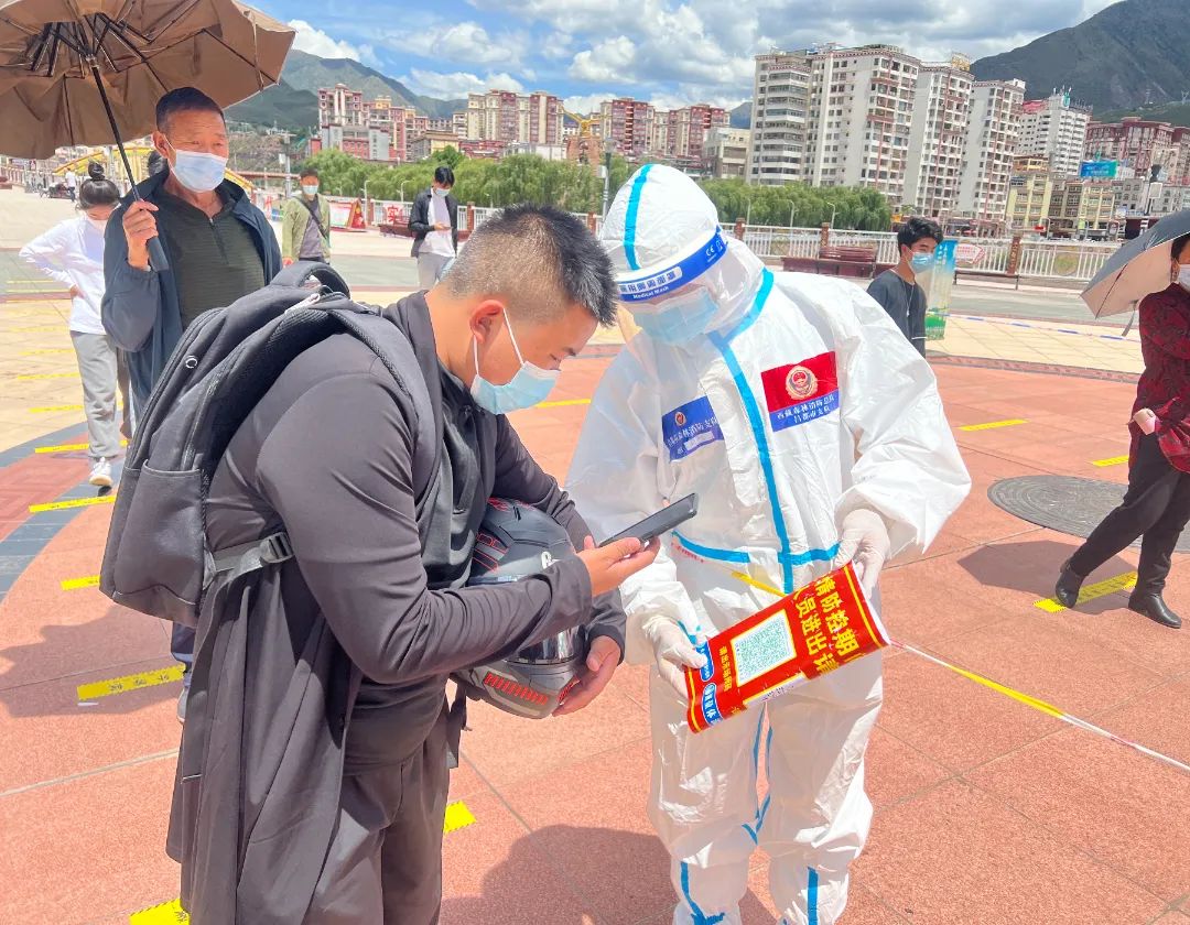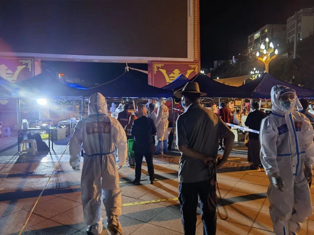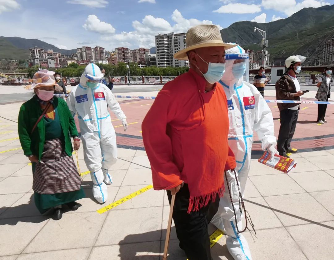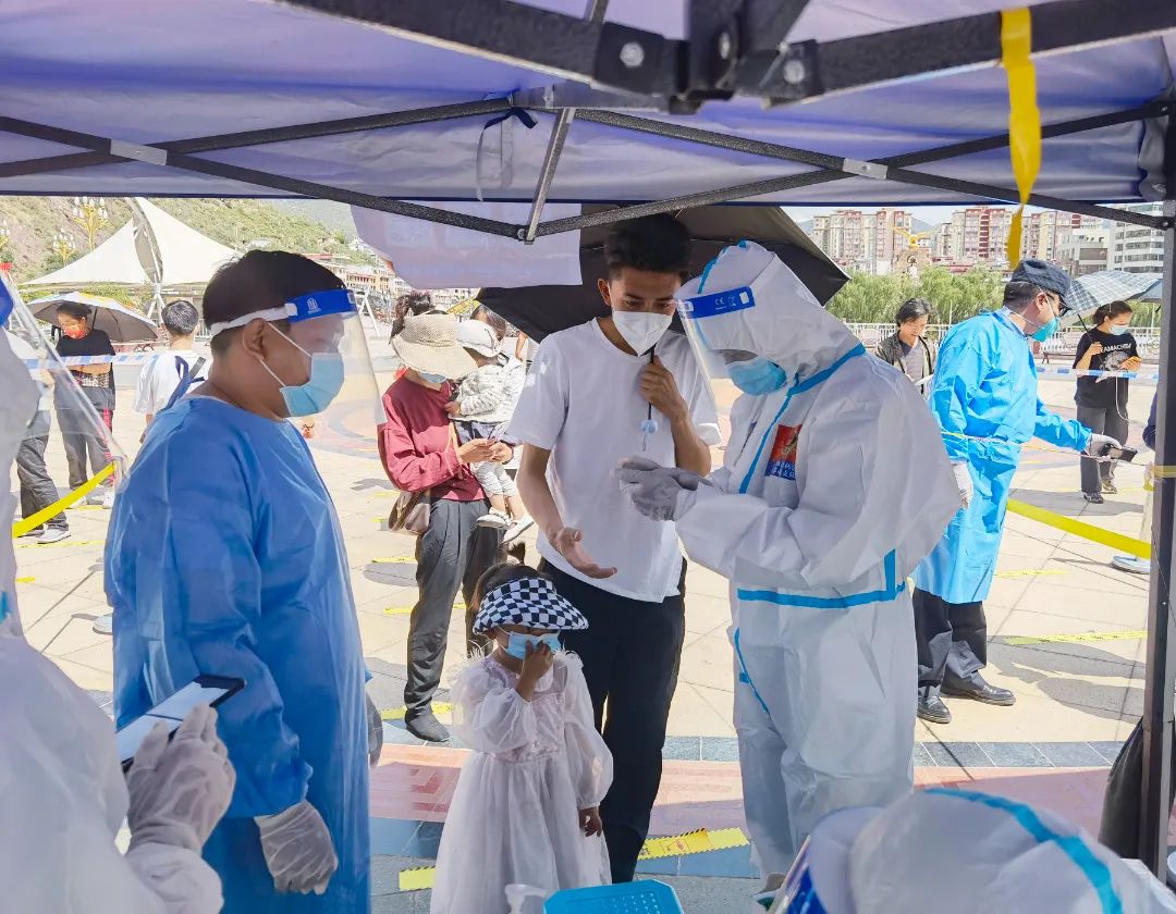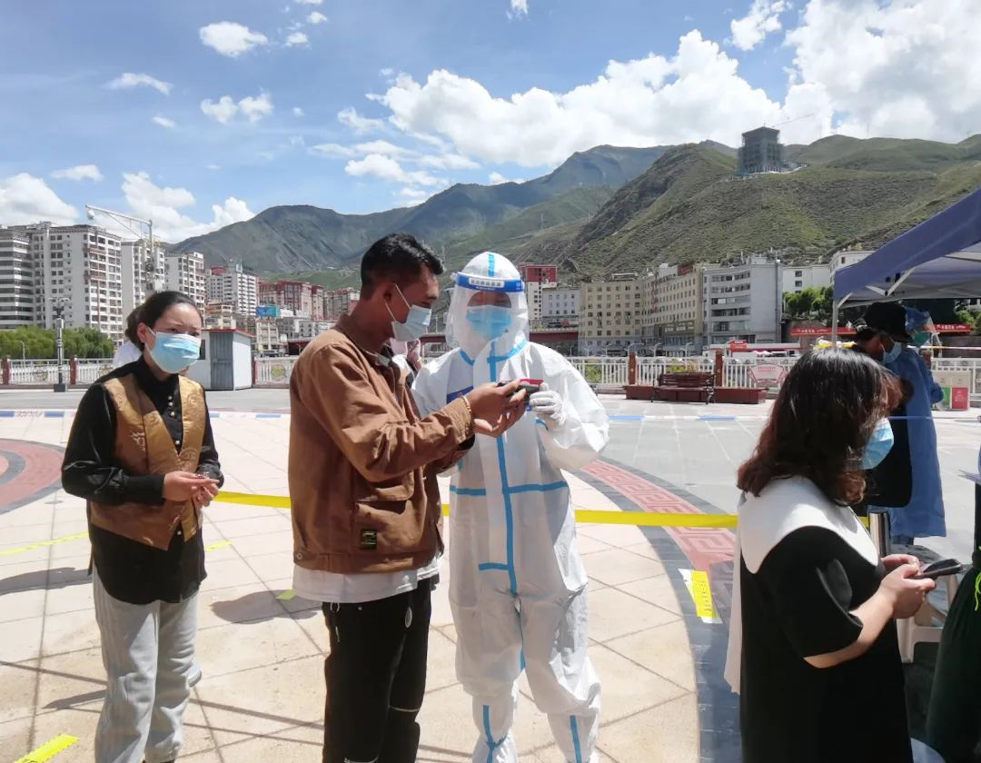 “為了您的安全,請保持1米以上間隔,謝謝。”晚上9點多,在茶馬廣場,支隊三級消防士張興梁,依然堅守在抗疫一線,維持著排隊做核酸的長隊。從早上7點開始,張興梁和其他消防隊員已堅守了14個多小時。“西藏晝夜溫差特大,白天防護(hù)服里面衣服都濕透了,但是到晚上這個點已經(jīng)干了,正好不用換衣服了?!睆埮d梁打趣的說到。