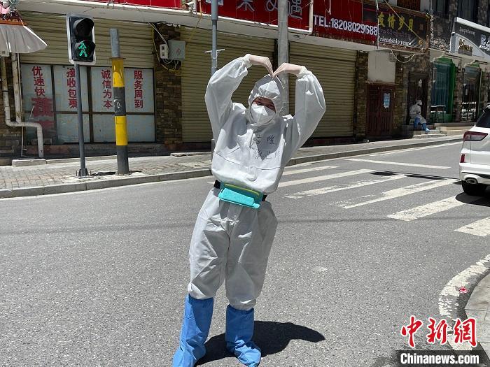 民警賀東在做好自身防護(hù)的前提下不停巡邏排查,一轉(zhuǎn)就是8個(gè)小時(shí)。他為民眾、游客及工人聯(lián)系購(gòu)買生活物資、煤氣等。汗水浸濕在口罩里,不到一會(huì),“大白”就能“喝”到自己的汗水。