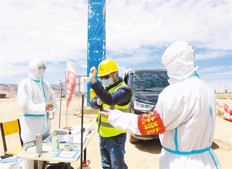 在西藏阿里普蘭機場項目施工現(xiàn)場,施工人員經(jīng)過體溫檢測、身份登記、消毒等程序后,才能進入工地。施工現(xiàn)場機器轟鳴,管理人員分兵把口,施工人員各司其職,整個工地處處都是忙碌的身影。