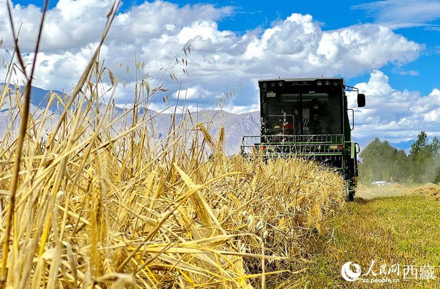 農(nóng)戶使用收割機(jī)收青稞。次仁羅布 攝
