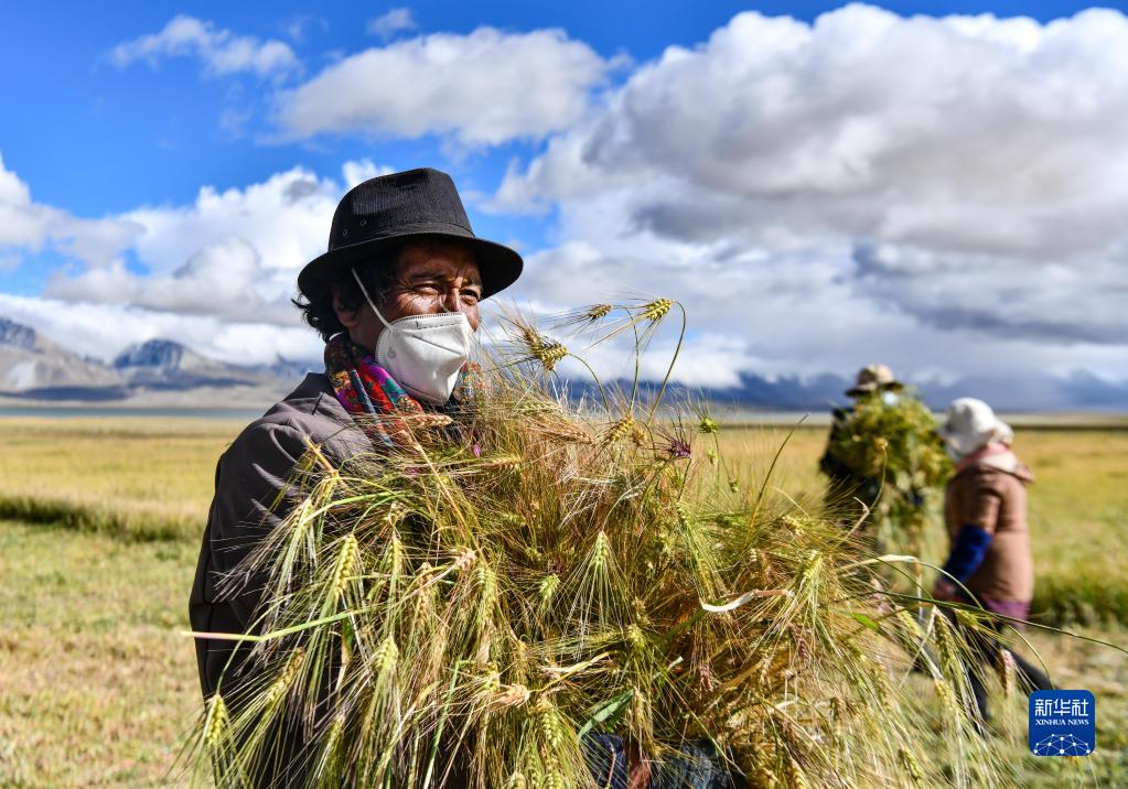 西藏拉薩市林周縣邊林鄉(xiāng)當(dāng)杰村玉沖組村民在收割小麥(2022年9月6日攝)。新華社記者 姜帆 攝