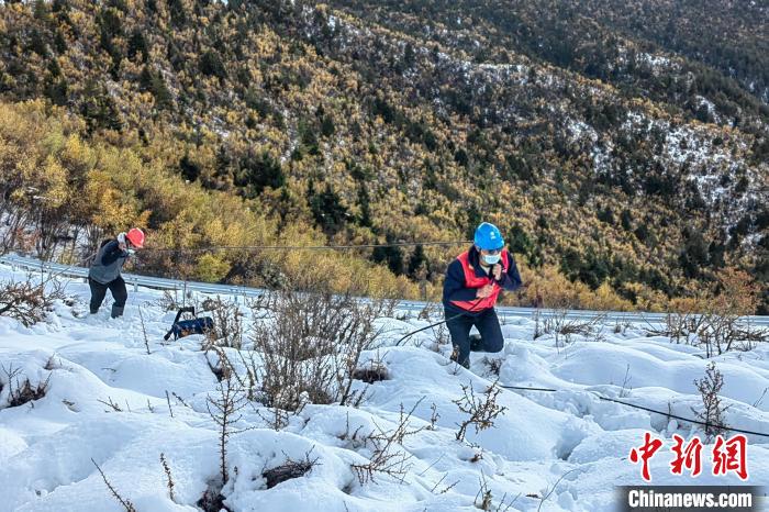 圖為搶修人員在西藏洛扎縣對大雪導(dǎo)致?lián)p壞的線路進行搶修。多吉朗杰 攝