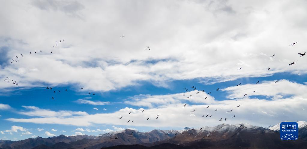 黑頸鶴群飛過林周縣強(qiáng)嘎鄉(xiāng)境內(nèi)山梁(11月6日攝)。新華社記者 姜帆 攝