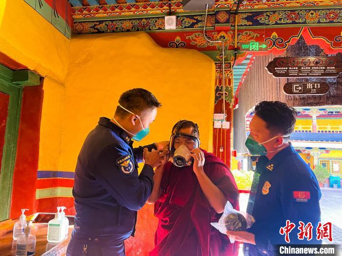 圖為消防員指導(dǎo)僧人學(xué)習(xí)佩戴防煙防毒面具?!±_市消防救援支隊(duì)供圖