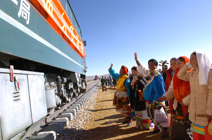2004年10月10日,藏北群眾迎接火車抵達(dá)那曲。10月9日,青藏鐵路安多到那曲138公里的鋪軌完成。10月10日,從安多出發(fā)的西藏境內(nèi)第一列火車上午10點(diǎn)抵達(dá)藏北重鎮(zhèn)——那曲鎮(zhèn)。