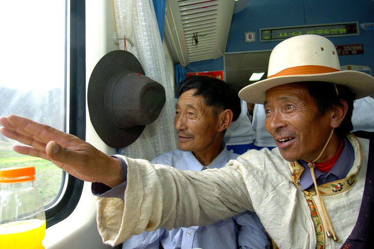 2006年7月1日,烏金(右一)在“藏2”次列車經(jīng)過(guò)自己家鄉(xiāng)安多時(shí),興奮地指向車外,向同伴介紹。