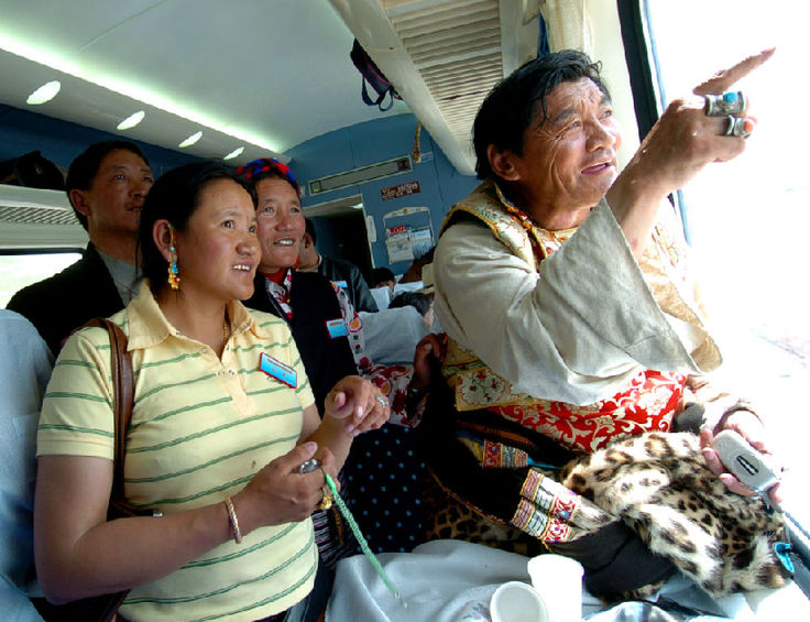 2006年7月1日,乘坐“藏2”次列車的藏族牧民(右)在欣賞窗外的美景。