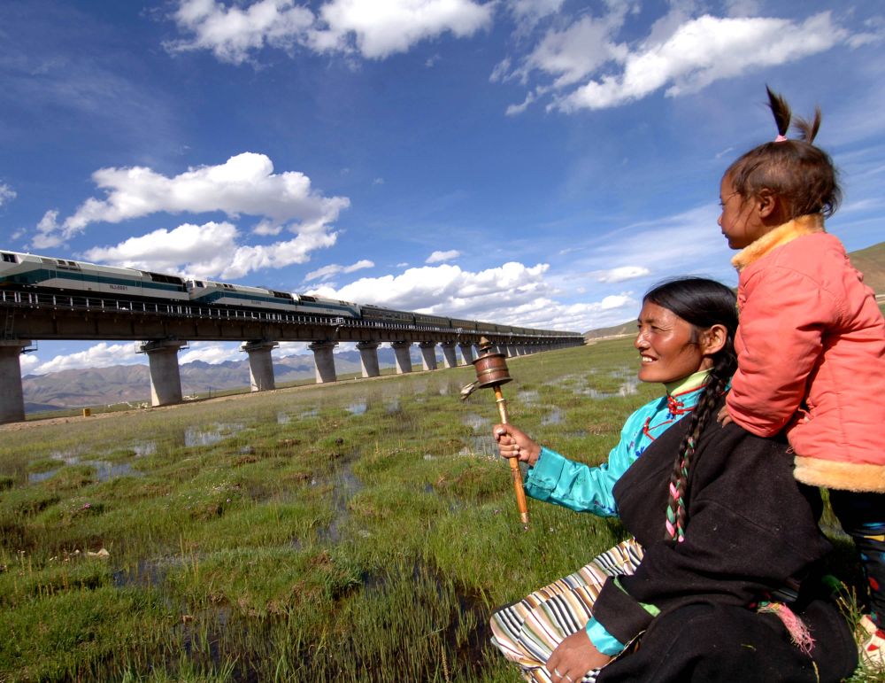 2006年6月17日,白瑪拉姆背著尼瑪拉姆看著從自家門口駛過(guò)的火車。