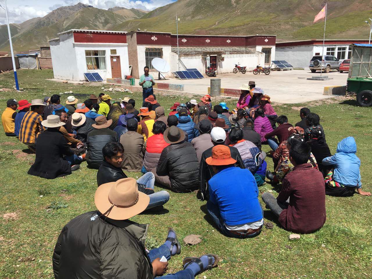 圖為中國(guó)人壽西藏分公司駐村工作隊(duì)員向村民宣講最新的涉農(nóng)、涉牧保險(xiǎn)知識(shí)。