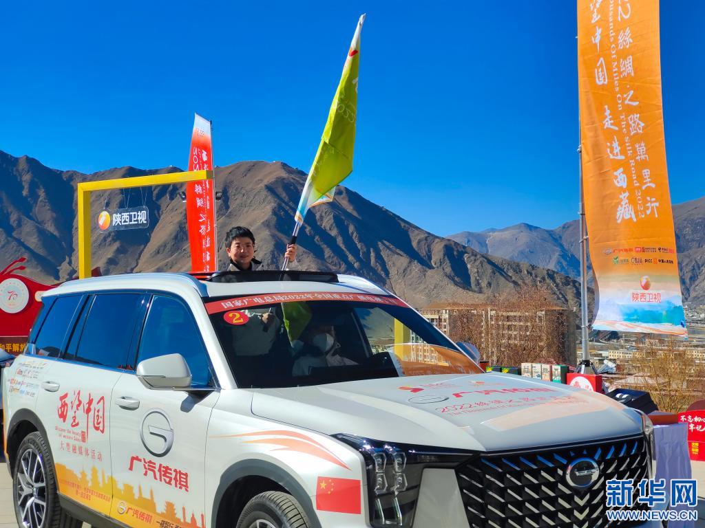 在拉薩市文成公主實景劇場前的廣場上,一列車隊緩緩駛過。有人從天窗探出身子揮舞著旗幟,旗上寫著:“2022絲綢之路萬里行,西望中國”。