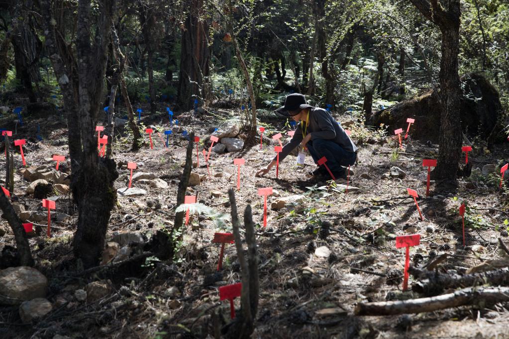 在波密縣扎木鎮(zhèn)東若村林地,工作人員在查看林下?lián)嵊牟靥炻槌砷L情況。新華社記者 金立旺 攝