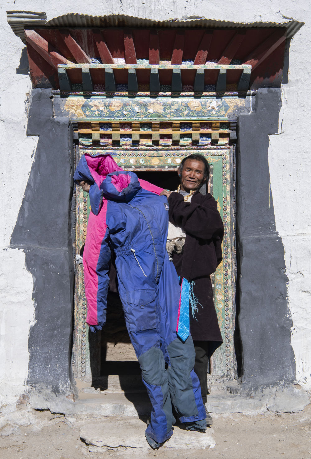 格桑在展示自己登頂時(shí)穿過的連體羽絨服(2020年1月22日攝)。