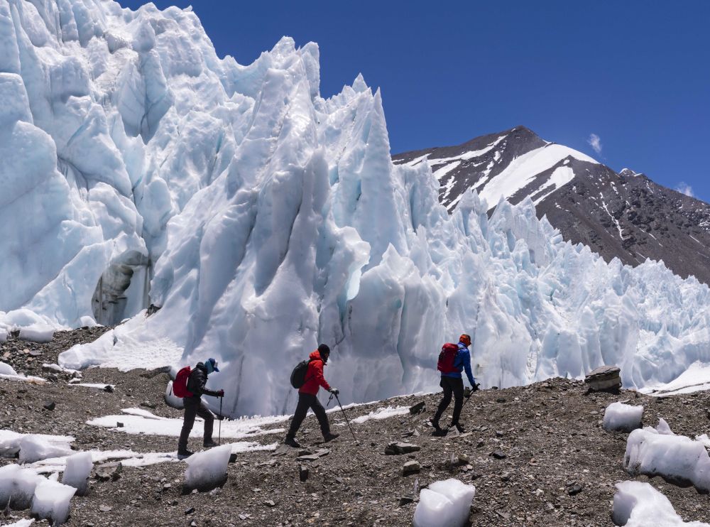德慶歐珠(右)在珠峰海拔6000米左右的絨布冰川冰塔林間徒步(2019年5月21日攝)。