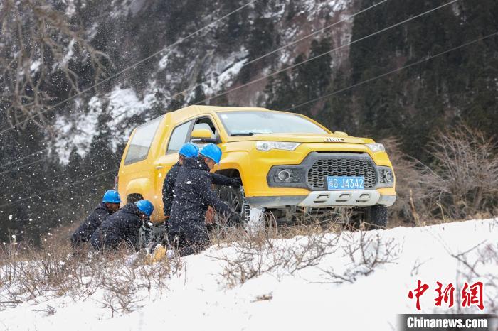盤山公路上,積雪和暗冰使車輛打滑無(wú)法繼續(xù)前行,羅布頓珠和隊(duì)友只好下車,給車輛掛好防滑鏈繼續(xù)前行,原本兩個(gè)小時(shí)的車程,這次花了4個(gè)小時(shí)才抵達(dá)巡線點(diǎn)。