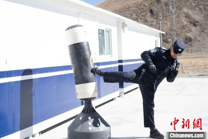 圖為羅布日常鍛煉打拳,他背后是去年12月新建的板房。 貢嘎來松 攝
