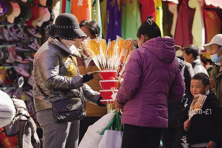 “市場現(xiàn)有1200多家商戶,經(jīng)營商品有零食、蔬菜、肉類、干雜、五金、服裝等。藏歷新年臨近,每天前來置辦年貨的市民絡(luò)繹不絕,日均人流量超1萬。為保證藏歷新年期間年貨充足,市場商戶們提前籌備、積極備貨,目前,各類商品庫存充足、品種豐富,基本上能夠滿足不同消費者的需求?!睕_賽康商貿(mào)有限公司負責人尼瑪告訴記者。此外,沖賽康市場將于2月19日至27日暫停營業(yè),28日起正常營業(yè)。