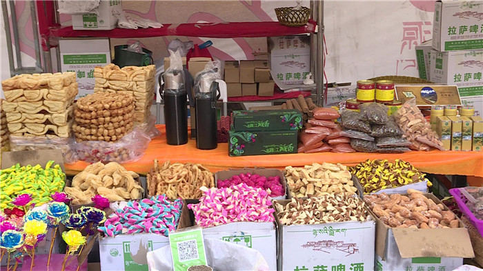 與往年一樣,酥油、卡賽、人參果等傳統(tǒng)食品和五彩青稞穗等仍是主角,來自新疆的果干、當(dāng)?shù)氐男迈r水果也同樣備受群眾喜愛。