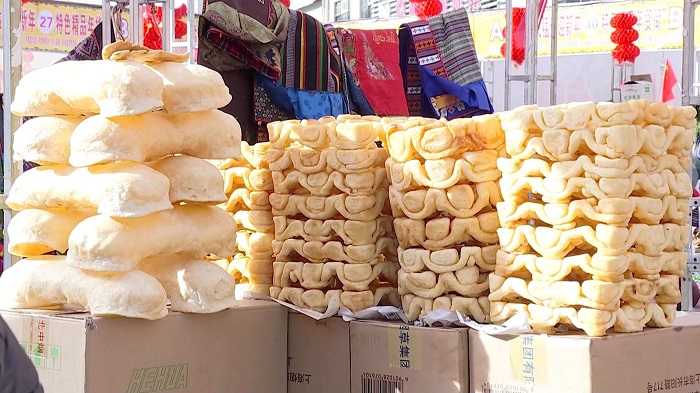 市民普珍是和親戚一起來購置年貨的,才來不久,她已經(jīng)買了整整一大箱子。普珍說,“買了德嘎,還有青稞,我們在家里擺著,是過年的傳統(tǒng),一家人高高興興地團聚。”