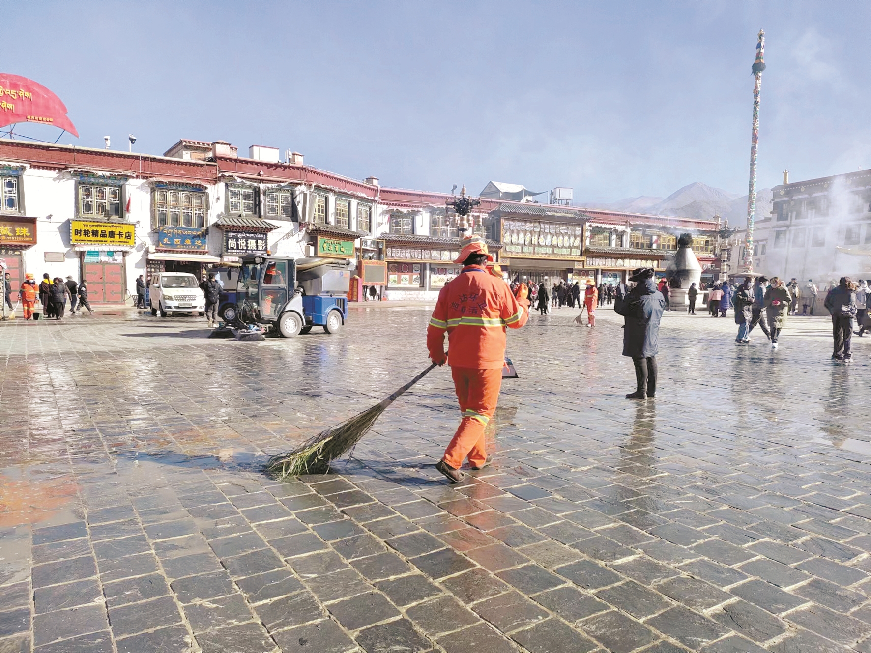 “今天,針對(duì)大昭寺廣場(chǎng)衛(wèi)生整治,我們一共出動(dòng)了20余名保潔人員,還有一臺(tái)小高壓沖洗車和兩臺(tái)小型機(jī)掃車。通過人機(jī)結(jié)合的方式,對(duì)廣場(chǎng)進(jìn)行徹底的衛(wèi)生大掃除,希望在藏歷新年期間,為市民營(yíng)造一個(gè)良好的衛(wèi)生環(huán)境?!蔽鞑夭┤瓠h(huán)衛(wèi)服務(wù)有限公司督察員強(qiáng)巴偉色介紹說。