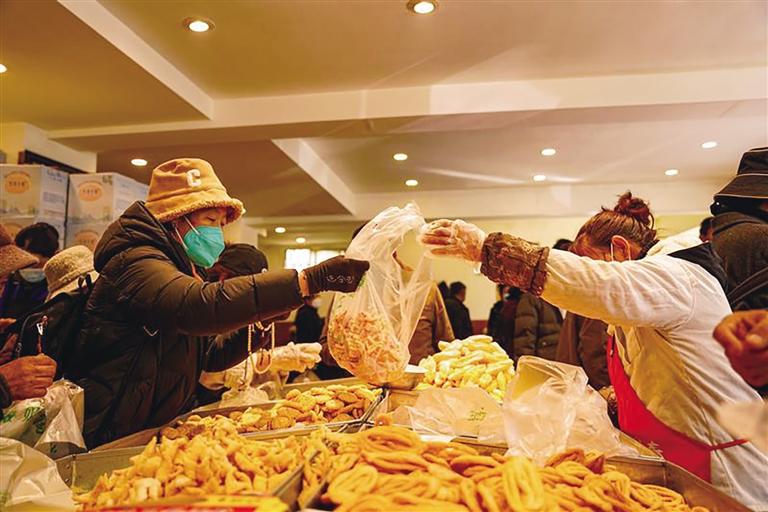 不遠處,尼珍藏式卡塞店的店員們正忙著制作“卡塞”,揉面、切割、染色,面片經(jīng)店員們的巧手捏成長條形、圓形、蝴蝶形等不同樣式,最后放到油鍋炸至金黃,出鍋后瀝油再撒上白糖,香甜可口、樣式精美的卡塞就制作完成了。新鮮出爐的卡塞顏色金黃、香氣四散開來,市民們爭相選購?!拔覀冏隹ㄈ呀?jīng)25年了,今年1月10日開門營業(yè),很多老顧客就來光顧了,每天收入在2000元至3000元之間,而且我們選用的原材料比較好,再加上現(xiàn)場制作、新鮮銷售,生意好的時候賣得更多?!崩习迥嵴涓嬖V記者:“我們店制作的卡塞價格實惠,連續(xù)8年沒有漲價,每斤30元,今年準(zhǔn)備營業(yè)到藏歷十二月二十九(公歷2月19日)歇業(yè)。”