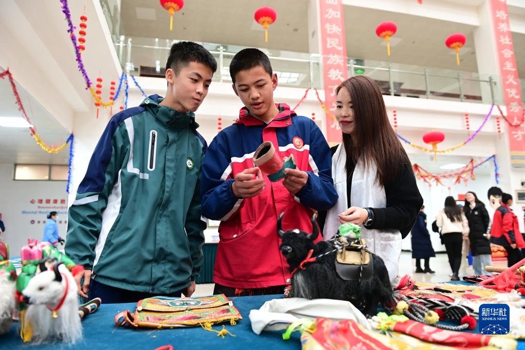 2月21日,在西安市浐灞第一中學(xué)舉行的藏歷新年團拜活動上,家長和學(xué)生參觀藏族文化展。新華社記者 李一博 攝
