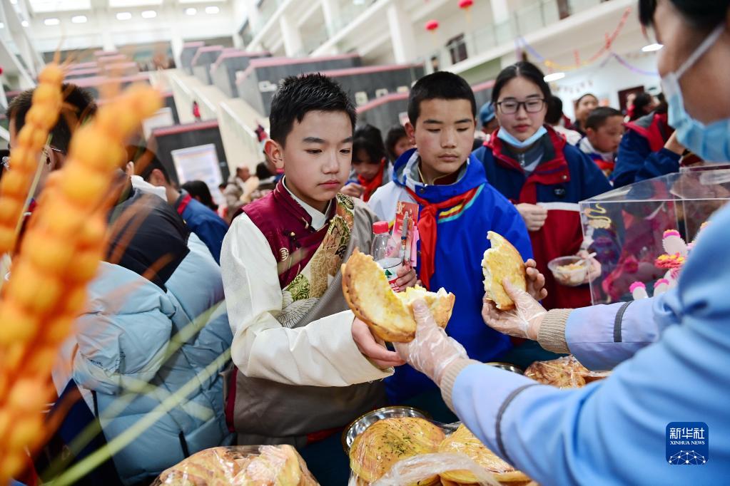 2月21日,在西安市浐灞第一中學(xué)舉行的藏歷新年團拜活動上,學(xué)生品嘗特色小吃。新華社記者 李一博 攝