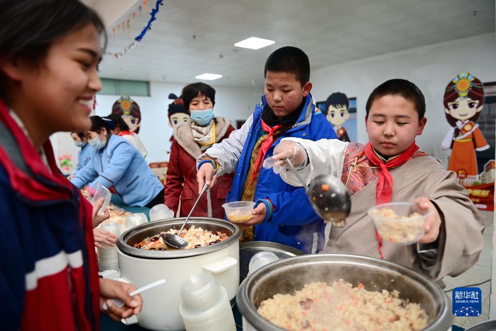 2月21日,在西安市浐灞第一中學(xué)舉行的藏歷新年團拜活動上,漢藏學(xué)生品嘗特色小吃。新華社記者 李一博 攝