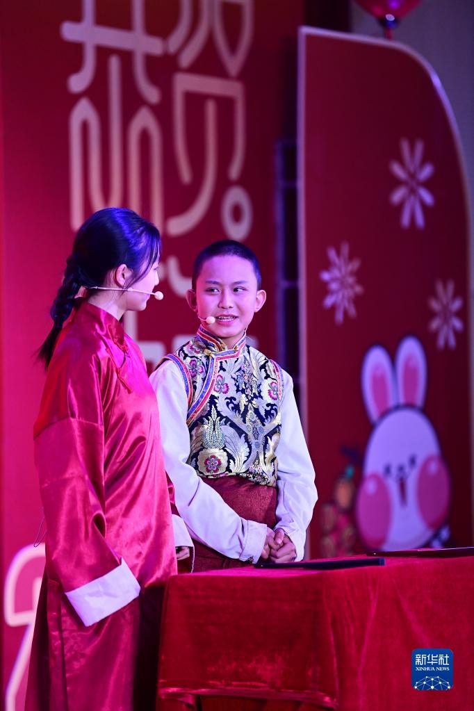 2月21日,在西安市浐灞第一中學(xué)舉行的藏歷新年團拜活動上,漢藏學(xué)生一起表演相聲。新華社記者 李一博 攝