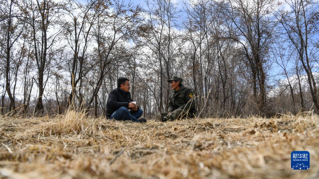 在西藏山南市隆子縣,扎西江村(左)與護(hù)林員在林中席地而坐,交流當(dāng)?shù)厣鷳B(tài)環(huán)境問題(2月14日攝)。新華社記者 晉美多吉 攝