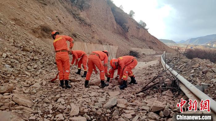 圖為昌都市卡若區(qū)森林消防中隊(duì)“火焰藍(lán)”志愿服務(wù)隊(duì)清理滑坡路段。 昌都市卡若區(qū)森林消防中隊(duì)供圖