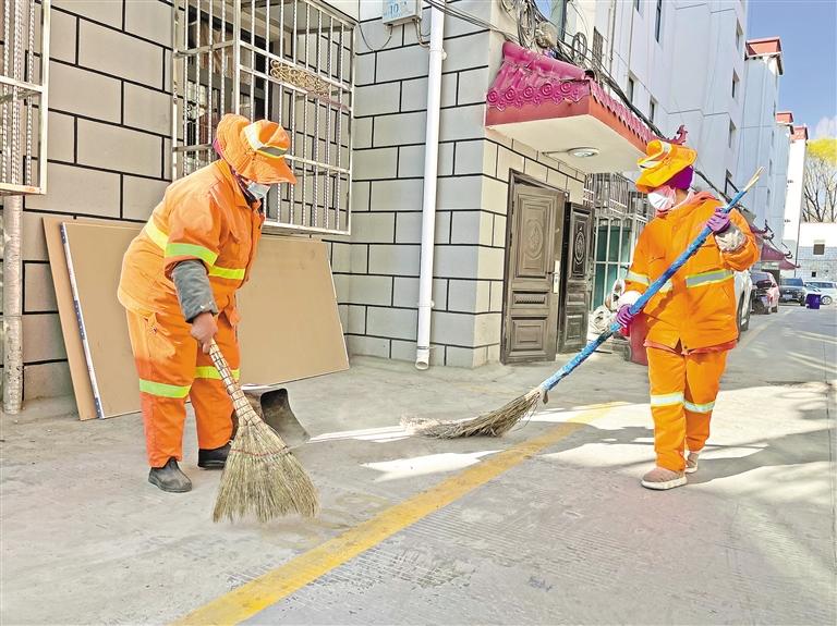 拉薩市城關(guān)區(qū)女環(huán)衛(wèi)工人在清掃地面。 旦增蘭澤 攝