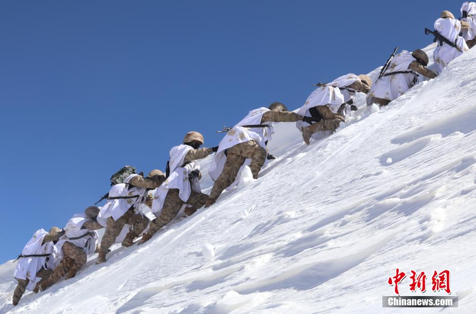 3月21日,阿里軍分區(qū)某邊防團(tuán)巡邏官兵翻越冰雪達(dá)坂向點(diǎn)位前行。李海亮 攝