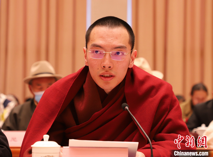 圖為宗教界代表達(dá)隆夏仲·阿旺洛?!さ┰銮岈斣谧剷习l(fā)言。 中新社記者 趙延 攝