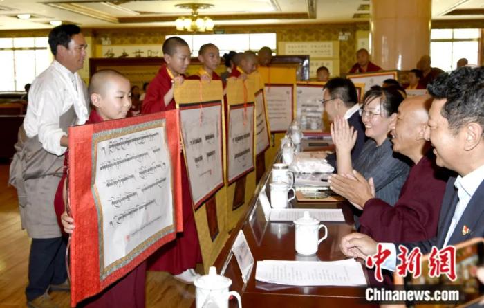 2022年7月,西藏佛學院9名少年活佛完成小學階段學習,在拉薩順利畢業(yè)。圖為少年活佛們在畢業(yè)典禮教育成果展上展示藏漢書法作品。李林 攝