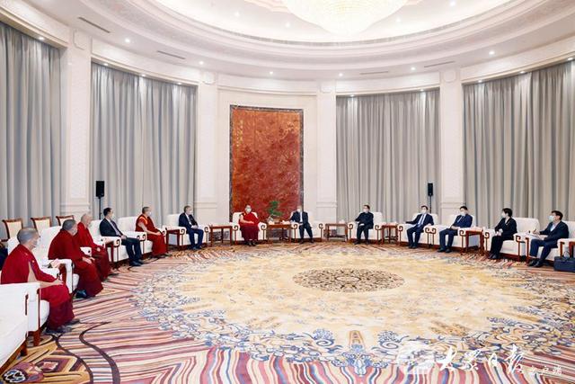 林武代表省委、省政府對(duì)班禪的到來(lái)表示熱烈歡迎,并簡(jiǎn)要介紹了山東經(jīng)濟(jì)社會(huì)發(fā)展情況。他說(shuō),山東是人口大省、經(jīng)濟(jì)大省、文化大省,當(dāng)前正深入貫徹黨的二十大精神,錨定“走在前、開新局”,堅(jiān)決打好強(qiáng)信心、穩(wěn)經(jīng)濟(jì)、促發(fā)展組合拳,經(jīng)濟(jì)呈現(xiàn)全面復(fù)蘇、加快向好的發(fā)展態(tài)勢(shì)。近年來(lái),我們?nèi)尕瀼匦聲r(shí)代黨的治藏方略,加強(qiáng)對(duì)口援藏工作,“魯藏一家親”結(jié)出累累碩果。山東是全國(guó)宗教工作重點(diǎn)省份,我們深入學(xué)習(xí)習(xí)近平總書記關(guān)于宗教工作的重要論述,全面落實(shí)黨的宗教信仰自由政策,全省宗教領(lǐng)域保持和諧穩(wěn)定的良好局面。班禪是藏傳佛教大活佛,堅(jiān)定擁護(hù)中國(guó)共產(chǎn)黨的領(lǐng)導(dǎo),為促進(jìn)藏傳佛教與社會(huì)主義社會(huì)相適應(yīng)發(fā)揮了重要作用。相信在您的帶領(lǐng)下,藏傳佛教愛(ài)國(guó)愛(ài)教、護(hù)國(guó)利民的光榮傳統(tǒng)一定能進(jìn)一步發(fā)揚(yáng)光大,更好引導(dǎo)信教群眾維護(hù)國(guó)家統(tǒng)一、民族團(tuán)結(jié)、宗教和諧。