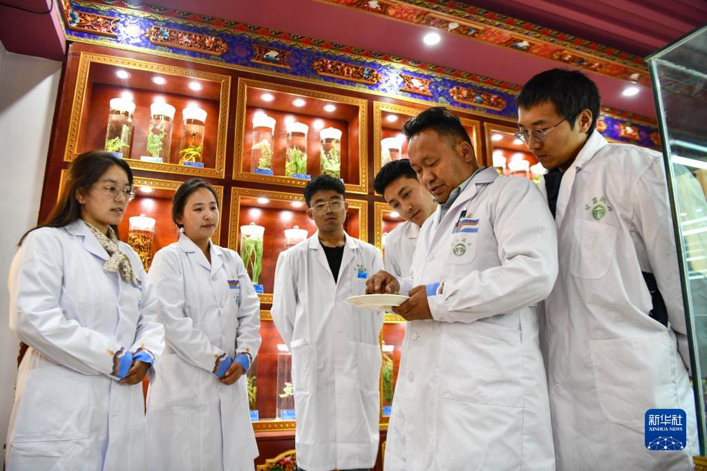 在藏藥材標(biāo)本室,普窮次仁為學(xué)生們講解藏藥材知識(4月20日攝)。新華社記者 晉美多吉 攝