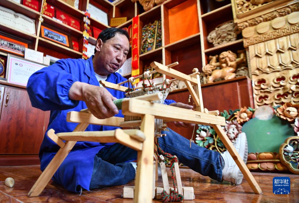 拉巴次仁在拼裝紡織機木雕工藝品(4月25日攝)。新華社記者 晉美多吉 攝
