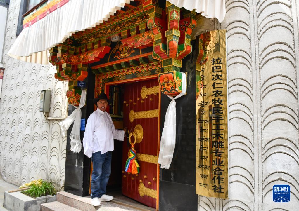 拉巴次仁在農(nóng)牧民手工木雕專業(yè)合作社門前(4月25日攝)。新華社記者 晉美多吉 攝