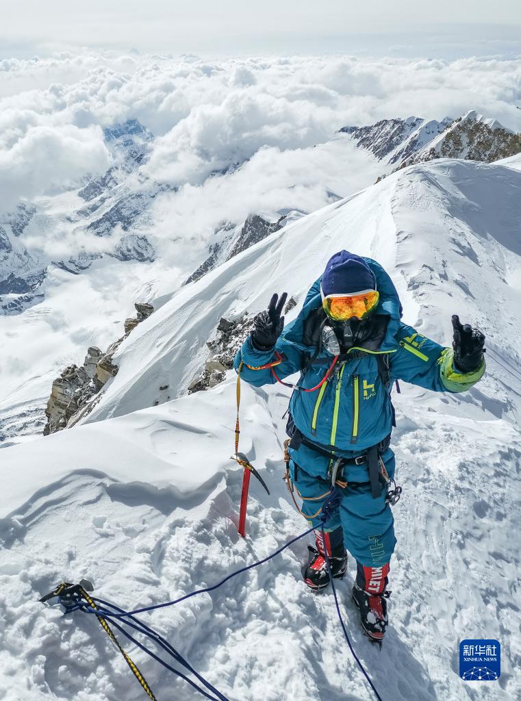 董紅娟在海拔8027米的希夏邦馬峰頂(4月26日攝)。新華社 頓巴 攝