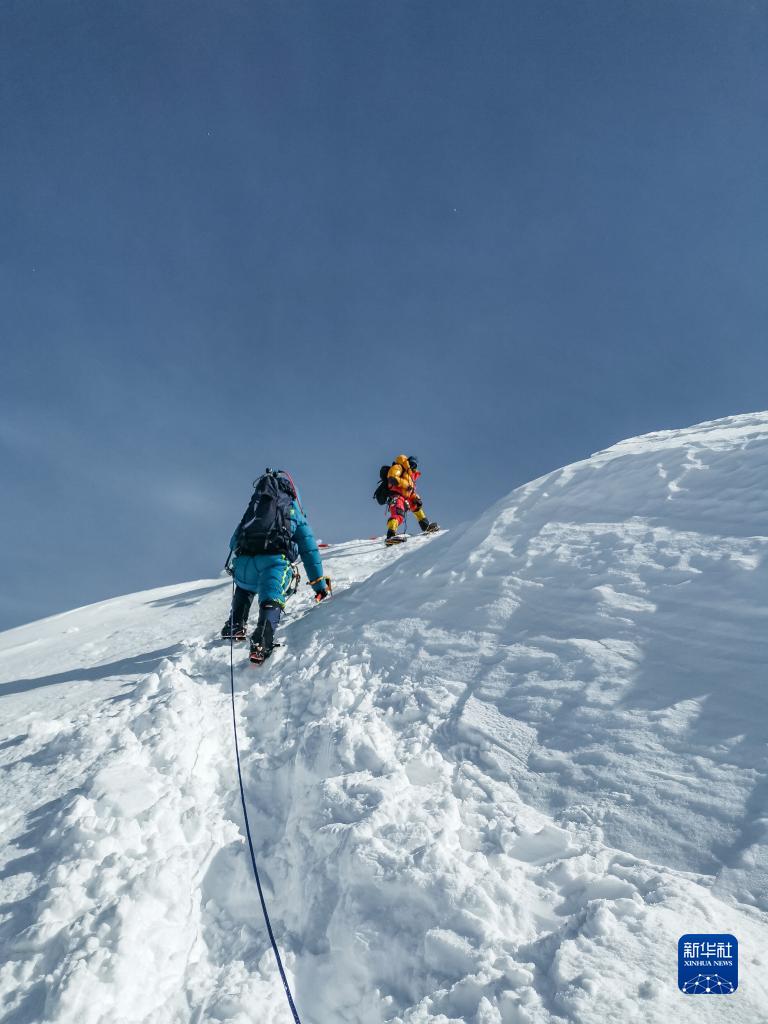 董紅娟(左)在登頂希夏邦馬峰后下撤(4月26日攝)。新華社 頓巴 攝