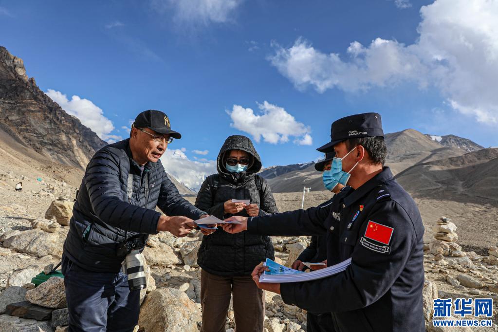 珠峰邊境派出所民警為景區(qū)游客發(fā)放安全注意事項宣傳單。
