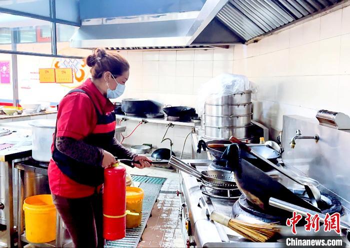 模擬廚房發(fā)生火災,員工發(fā)現(xiàn)火源后,立即關(guān)閉燃氣閥,拉閘斷電,第一時間利用周邊滅火器進行初期火災撲救。 劉瑜 攝