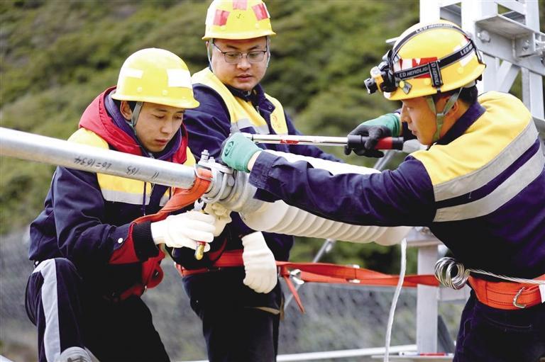 “高空作業(yè),大家把安全帽戴好!”彭江江不時(shí)提醒道。王偉點(diǎn)頭示意回應(yīng)工長(zhǎng)彭江江,隨后輕車熟路地將安全帶系在斜腕臂上,右手緊緊抓住上方的腕臂,右腳跨上懸空的定位管,左腳一蹬,穩(wěn)穩(wěn)地站在了斜腕臂上。工友蔣瀟和次仁加布也嫻熟地爬了上來(lái),他們動(dòng)作靈活協(xié)調(diào),身手敏捷矯健,整個(gè)過(guò)程連貫一通,無(wú)一點(diǎn)拖泥帶水。