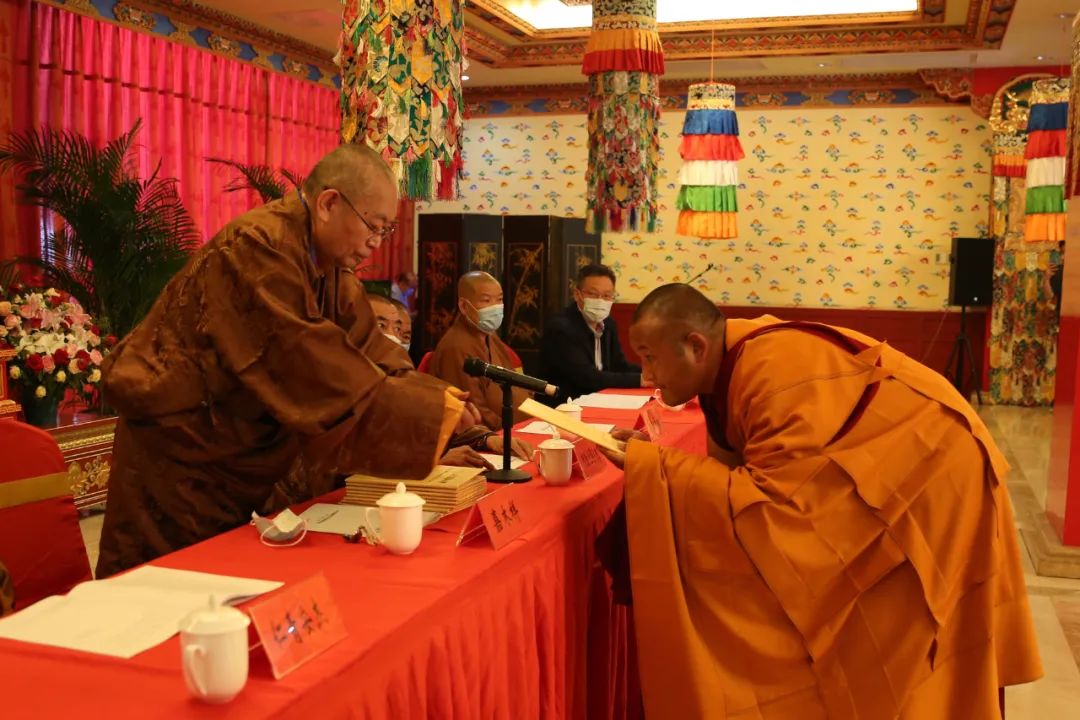 中國佛教協(xié)會副會長、藏傳佛教學(xué)銜工作指導(dǎo)委員會主任、中國藏語系高級佛學(xué)院院長嘉木樣活佛向“拓然巴”高級學(xué)銜獲得者頒發(fā)學(xué)銜證書。中國佛教協(xié)會副會長、藏傳佛教學(xué)銜工作指導(dǎo)委員會副主任珠康·土登克珠活佛向“拓然巴”高級學(xué)銜獲得者表示祝賀。