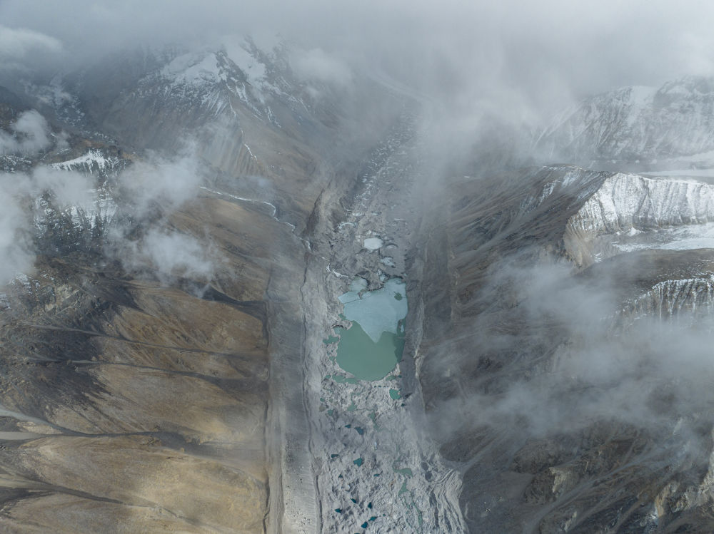 這是在海拔7000米左右高空拍攝的由絨布冰川融水形成的湖泊群(5月25日攝,無人機照片)。新華社發(fā)(旦增努布 攝)